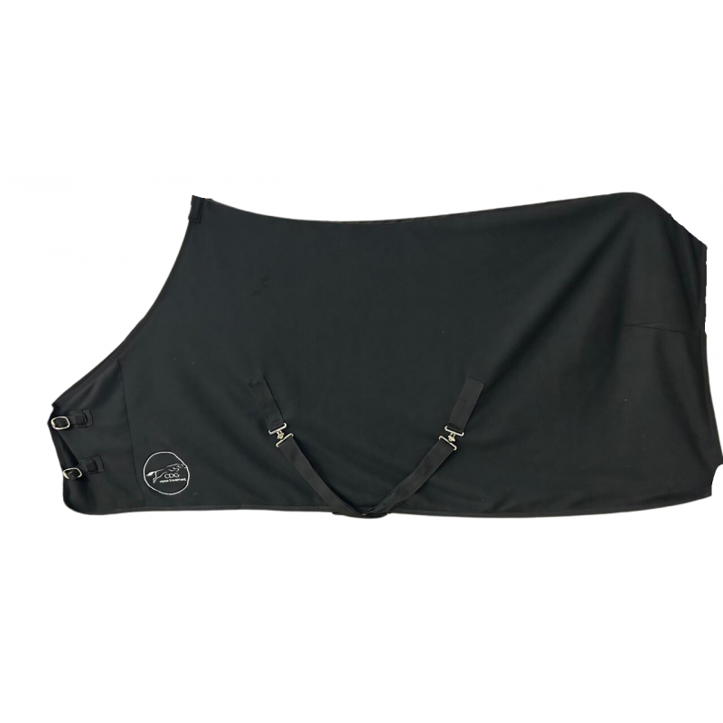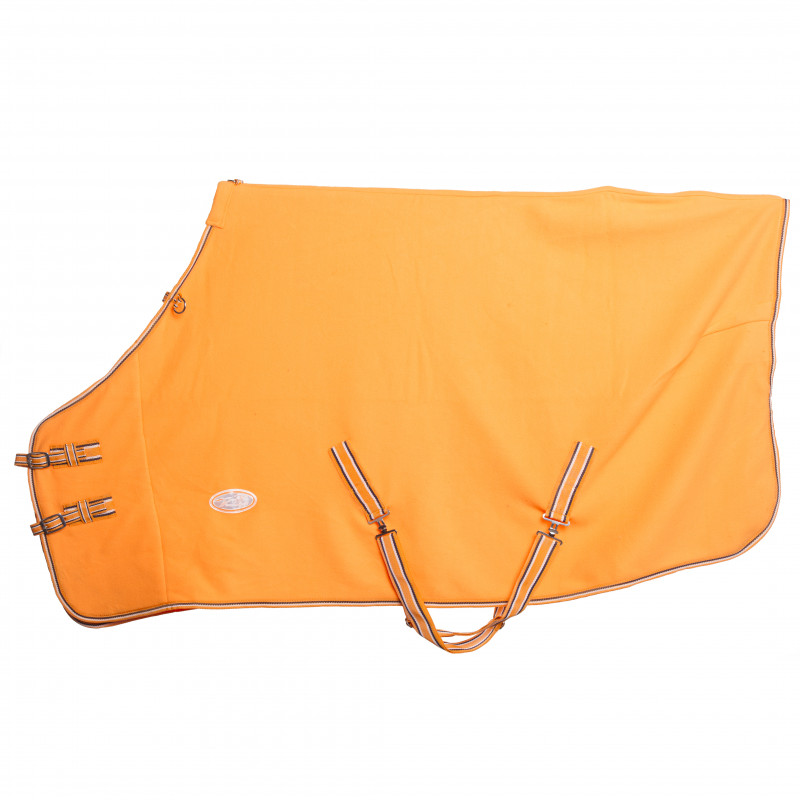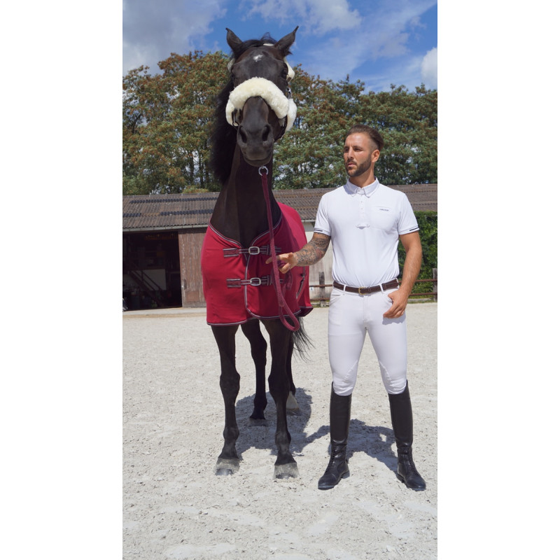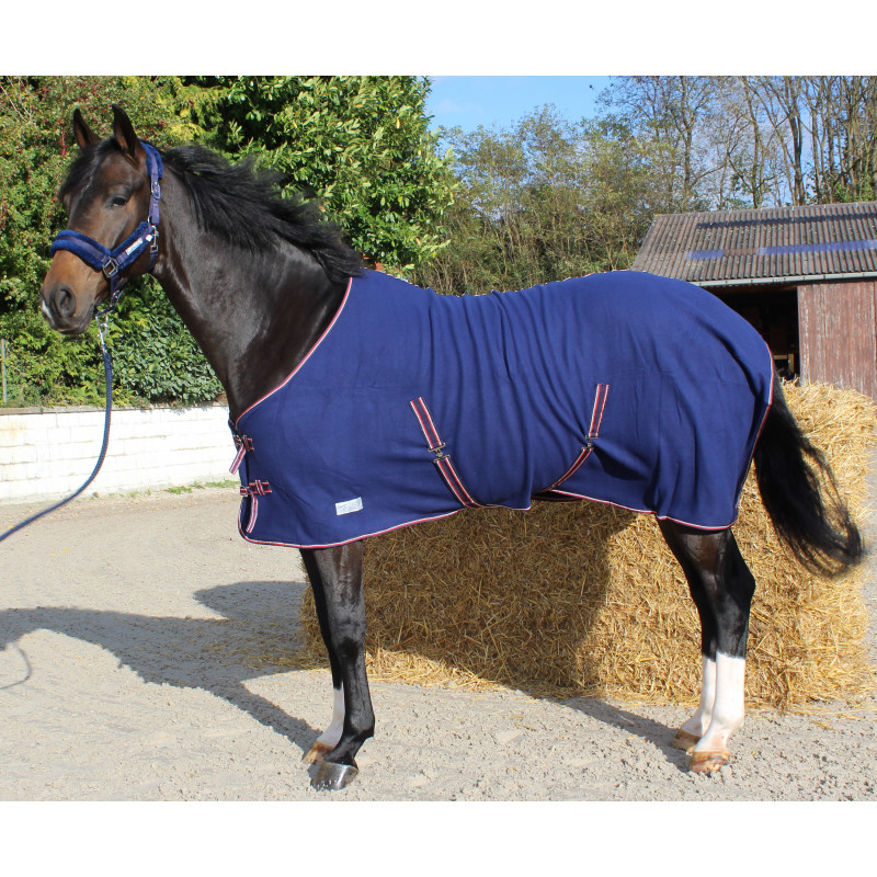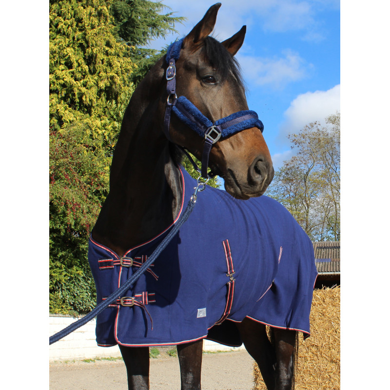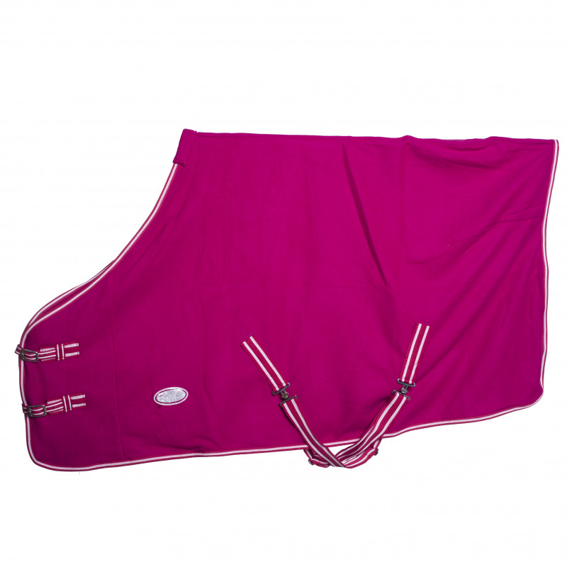 Pad de garrot en polaire anti-frottements. 2 Attaches croisées au poitrail ainsi que 2 sous le ventre et cordellete d'attache de queue. Bouclerie argentée. Lavable en machine et séchoir programme laine.
